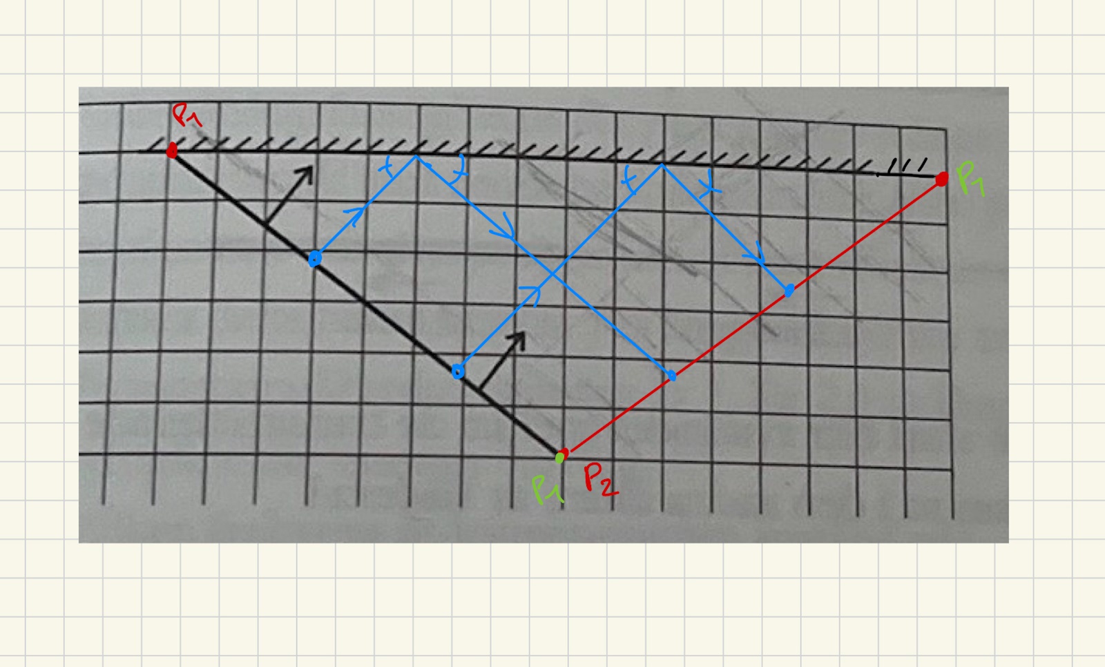 Den röda punkten för P1 och P2 är startpunkten. De gröna är slutpunkter. Varje punkt på vågen följer vägar likt de blåa linjerna. Alla reflekteras och hamnar på den röda linjen.