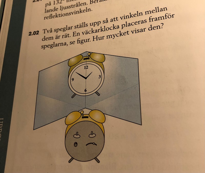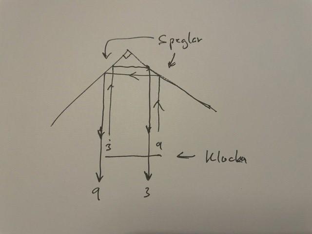 I detta exempel så ser du klockan genom dubbla speglar, så bilden är inte längre spegelvänd. Prova att rita en strålgång från en punkt på klockan till betraktarens öga så ser du att den studsar två gånger i speglarna.