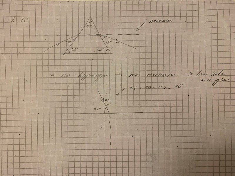 Det är så jag har kommit hittills. Förstår inte varför infallsvinkeln inte är lika stor som brytningsvinkeln.