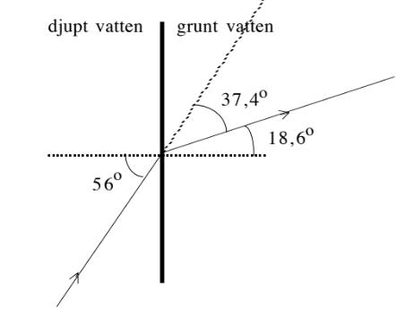 "En vattenvåg passerar in över ett rev. Vågfrontens infallsvinkel mot revkanten är 56°. I det djupa vattnet har vågen hastigheten 1,3 m/s och våglängden 2,1 m. När vågen rör sig in över revkanten minskar djupet kraftigt. Då minskar vågens hastighet till 0,5 m/s.