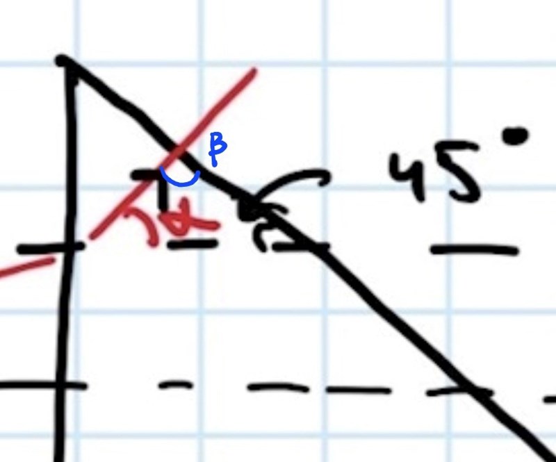 Här har du en triangel med två kända vinklar 45° samt och kan då enkelt beräkna den okända vinkeln (i blått):