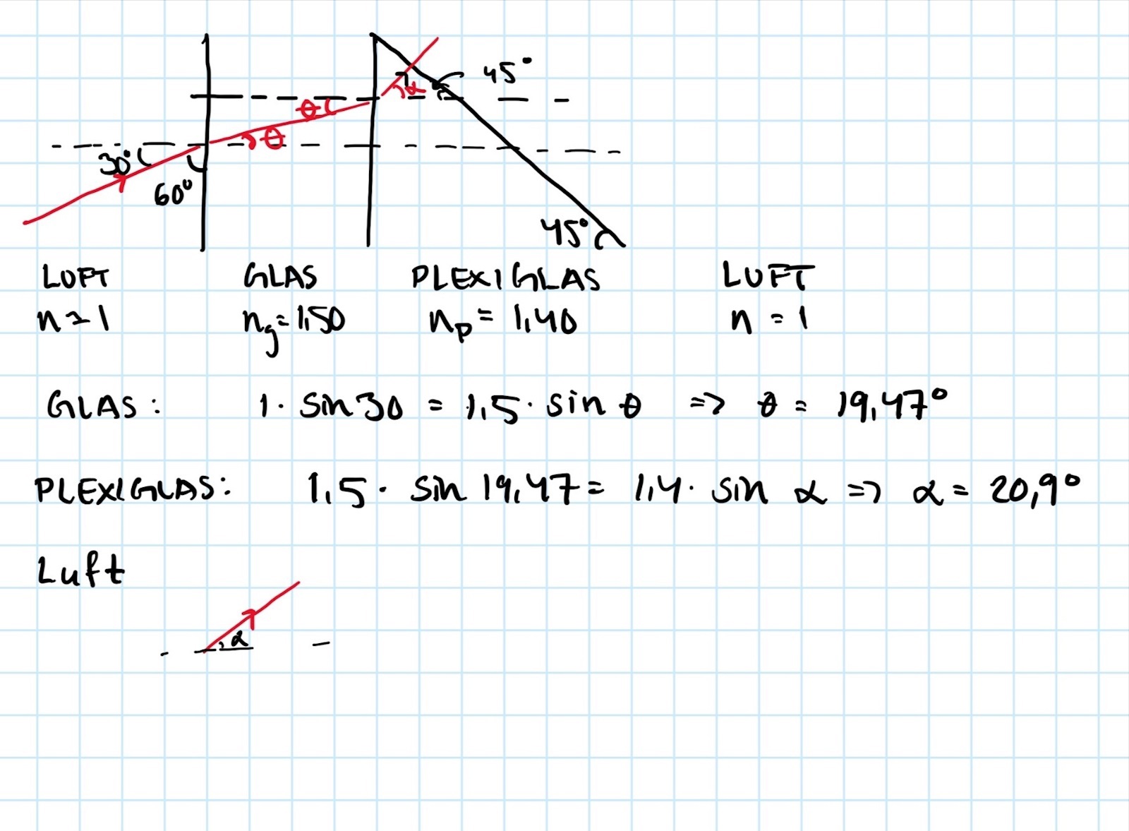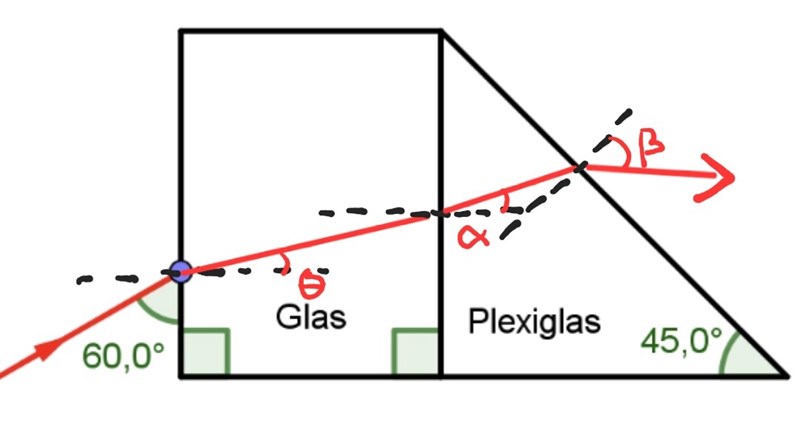 Infallsvinkeln ör ju relativt normalen, och problemet är att det i din tidigare skiss ser ut som om ljusstrålen infaller vinkelrätt mot gränsytan plexiglas/luft och du har då svårt att rita in normalen.