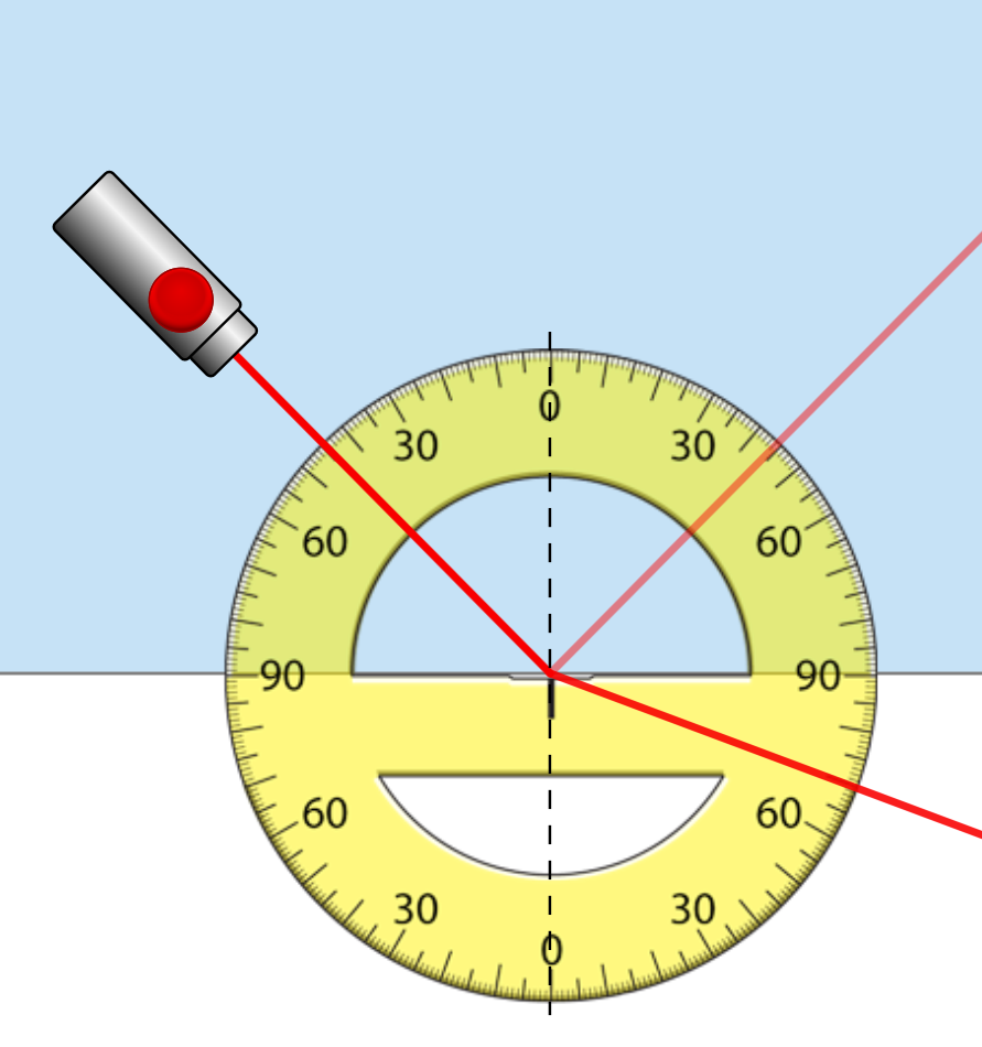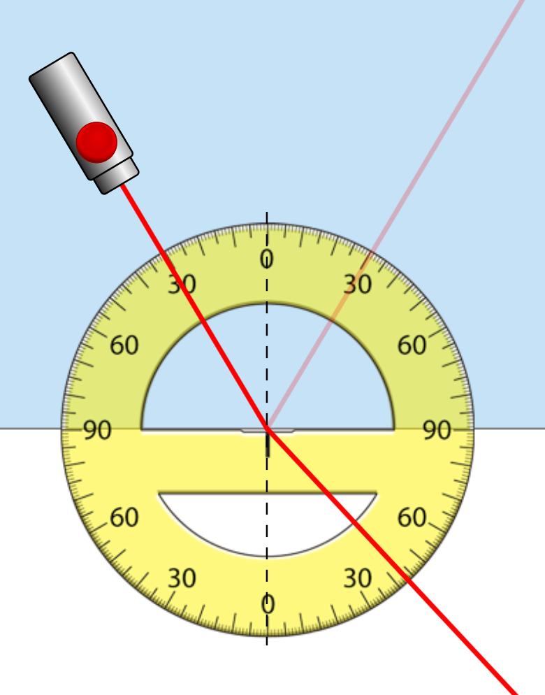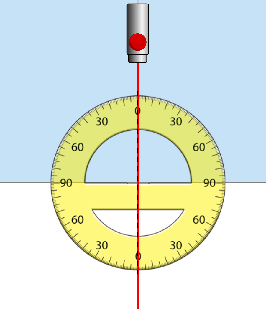 Strålen går rakt igenom. Ingen reflektion alls och ingen (eller 0°) brytningsvinkel. |