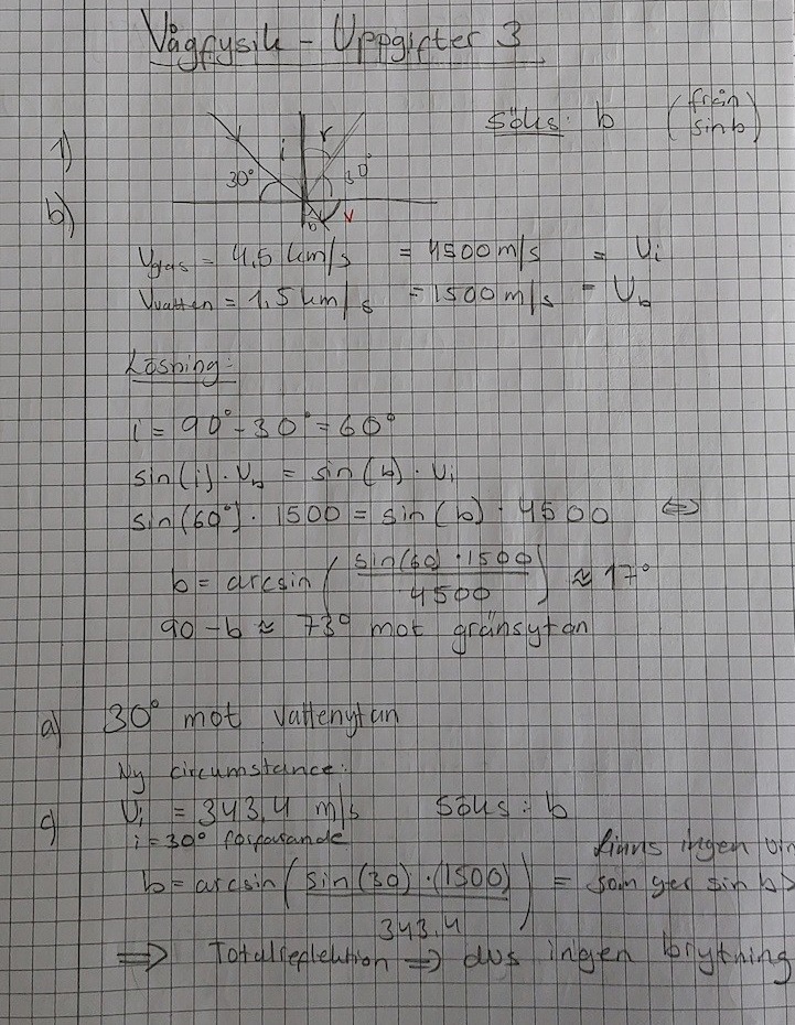 Den ekvationen saknar lösningar eftersom -1 ≤ sin x ≤ 1, så det finns ingen brytningsvinkel. Ljudet kan alltså inte tränga ner i vattnet i denna vinkel.