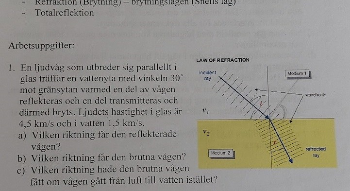 Jag märker att jag klarmarkerade tråden lite för fort...😅 I c) uppgiften visar det sig vara totalreflektion. Men vad är det i faktumet att det nu är från luft till vatten istället för från glas till vatten som gör att det är totalreflektion?