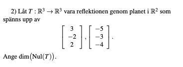Du behöver inte matrisen för att ta reda på dimensionen för nollrummet. T är en reflektion i ett plan d.v.s en vektor speglas på andra sidan planet. Om du nu kör avbildningen T igen på den nya vektorn så speglas den tillbaka och du får ursprungsvektorn igen. Avblidningen T är alltså sin egen invers. Vad stämmer generellt för nollrummet till inverterbara avbildningar?