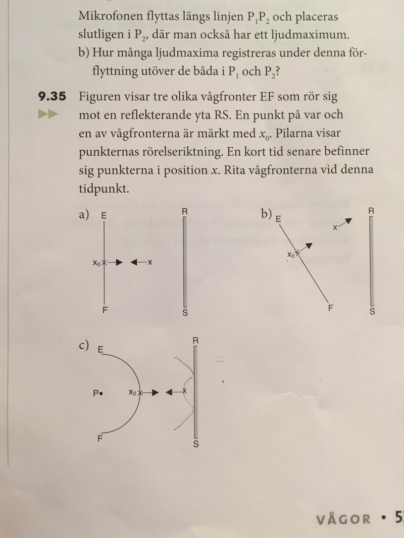 Hur löser man uppgift 9.35 c)? Jag har kladdat min lösning i blyerts. Jag började med att föreställa mig hur vågen skulle gått om inte väggen vore där, varefter jag spegelvände den del som hamnade bakom väggen. Det visade sig vara fel.