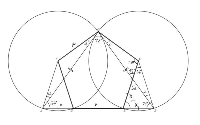 11. Beteckna cirkelradierna och 5-hörningens sidor med r samt sträckorna AD och EB med x.