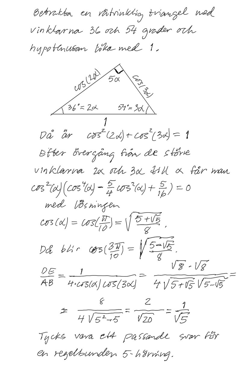 b) Bestäm förhållandet mellan femhörningens sida och , d.v.s. bestäm kvoten .