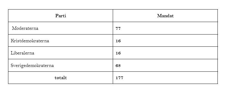 Tidöpartierna som regerar i Sverige nu med SD utanför regeirngen(M+KD+L+SD) 77+16+68+16=177 Majoritet