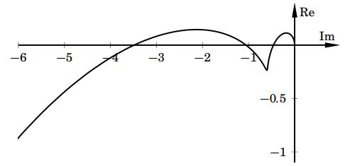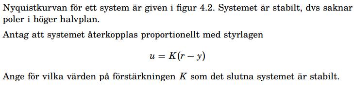 Jag förstår inte varför det är stabilt för 1 < K < 2. För alla K > 0.29 så skär ju kurvan axeln till vänster om punkten -1 någon gång. Har jag missuppfattat kriteriet? Trodde att kurvan alltid måste vara till höger om -1 när den korsar axeln. (OBS: Jag antar förresten att de märkt axlarna fel i figuren. Det bör vara tvärtom).