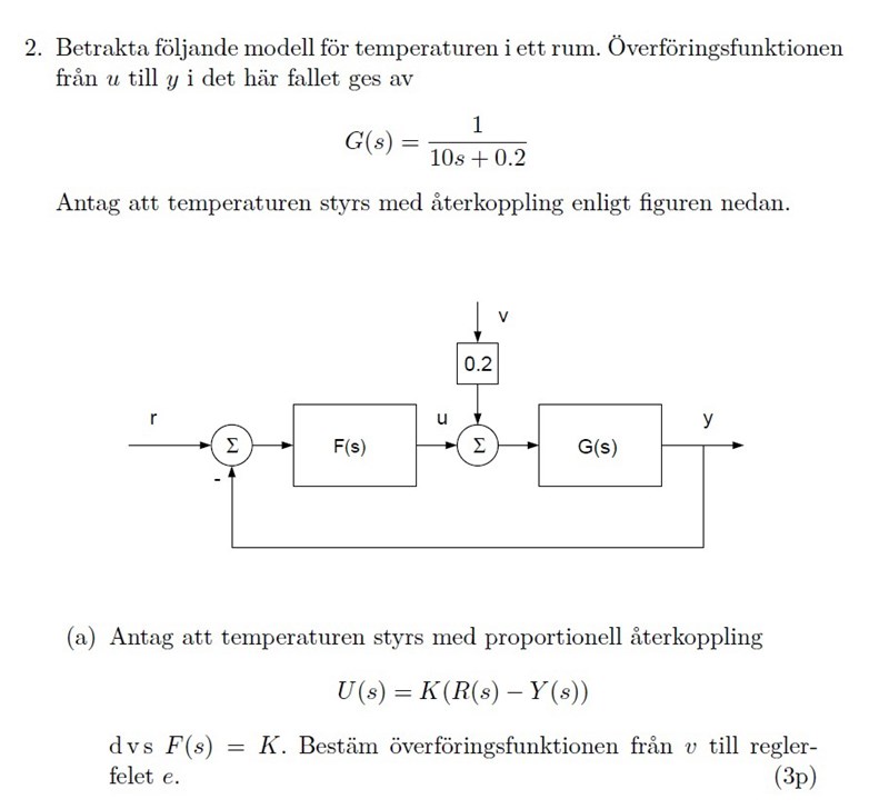 Skrev visst fel, det ska stå: S(s) = (1/5G)/(1+F(s)G(s)) = (-1)/(50s+1+5K)