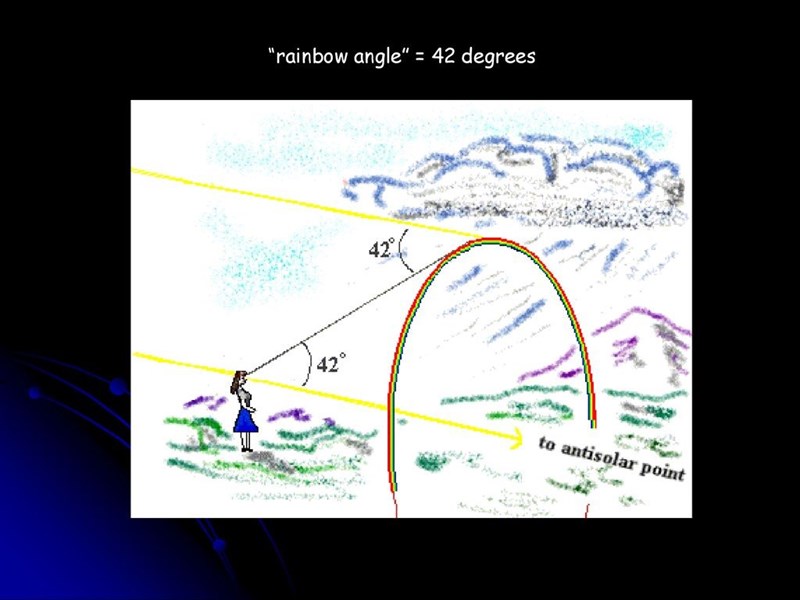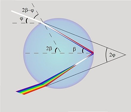 Regnbågen kommer från solljusets reflexion och brytning i sfäriska vattendroppar i luften och framträder kraftigast då vinkeln 2φ är 42˚.