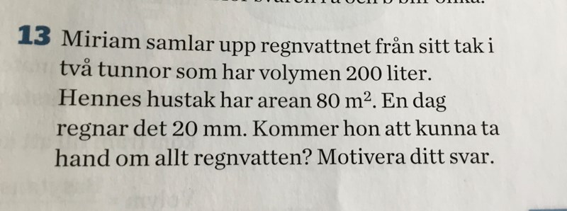 ditt mål är alltså att räkna ut hur mycket vatten det finns på taket när det har regnat 20 mm och sen se om det är mer eller mindre än 200 liter.