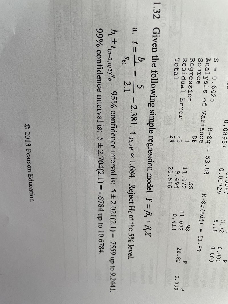 I tabellen letar de upp värdet för t med 36 frihetsgrader (38 mätningar - 2 framräknade beta) och signifinansnivå 5%. För att jämföra med det andra värdet och se om det är för långt ifrån 0 eller inte, så typ en standardisering (beta1-0)/medelfel