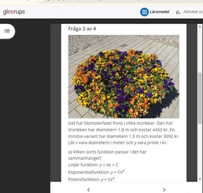 Det här blomsterfatet finns i olika storlekar. Den här storleken har diametern 1,8 m och kostar 4453 kr. En mindre variant har diametern 1,5 m och kostar 3092 kr. Låt x vara diametern i meter och y vara priset i kr.
