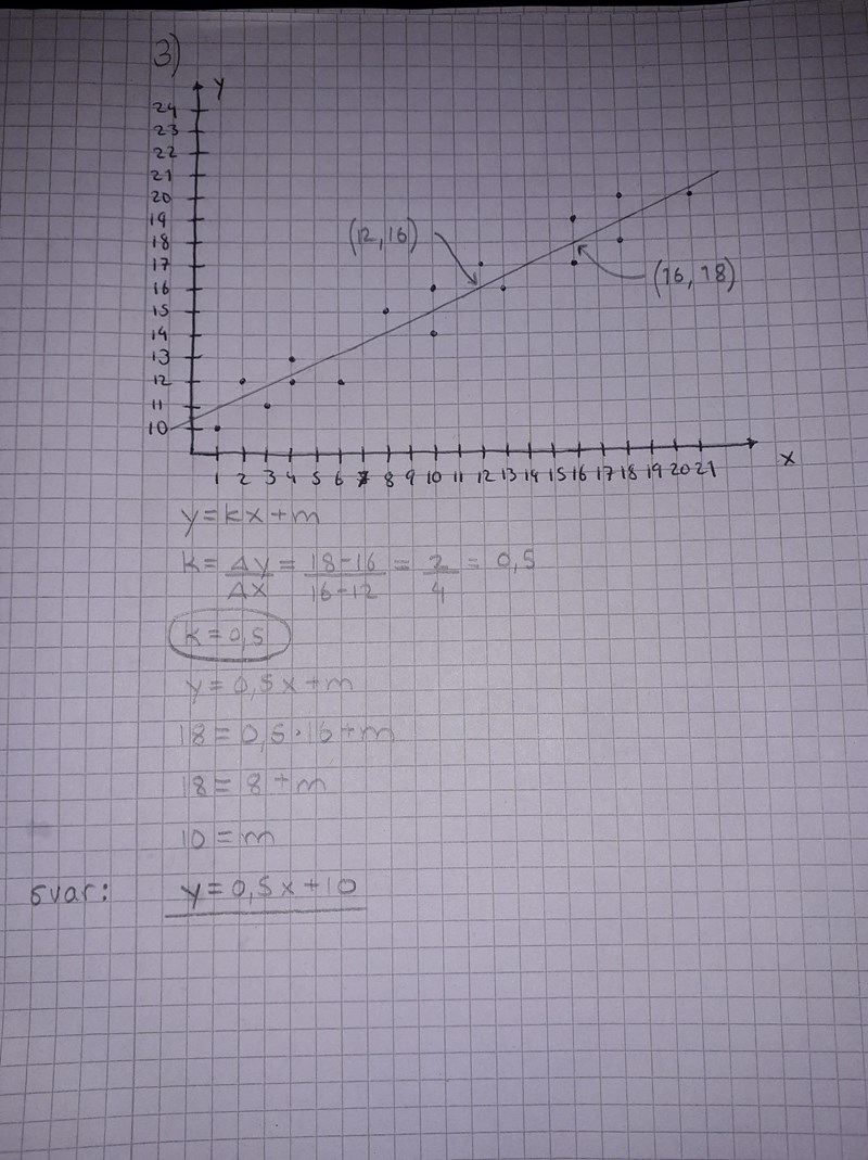 Vet ej om detta är rätt, men min fråga handlar mer om hur man faktiskt tänker när man till exempel gör en rät linje till en regressionsanalys och sedan gör en formel till den, det står liksom överallt att man ska använda sig utan en grafritande räknare för att få exakta värden på sådana här men det har jag inte, och när jag har frågat min lärare så har han sagt att man inte ''behöver'' en sådan typ av räknare för att lösa såna här uppgifter, utan man kan göra det själv. Men det känns så himla svårt att veta vart man ska placera linjen, här ser ni till exempel vart jag har placerat den, men ja kunde lika gärna ha placerat den så att den vinklar lite mer neråt, och då hade ju mitt ''k-värde'' blivit helt annorlunda, eller? Det känns som att jag inte ens löser dessa uppgifter om regressionsanalyser korrekt.