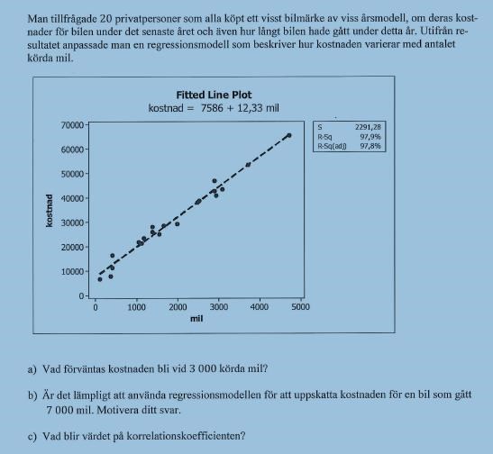 Fråga c) Denna tycker jag också är svår. Hur ska vi räkna ut korrelationskoefficienten här? På andra uppgifter har de skrivit vad determinationskoefficienten är och då blir det inte så svårt att räkna. Nu förstår jag inte!
