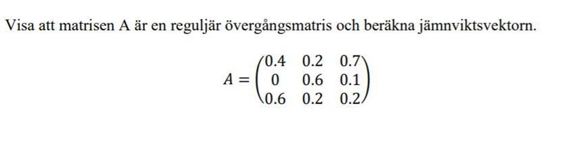 Hur har du försökt själv? Vad är en övergångsmatris? Hur beräknas en jämnviktsvektor?
