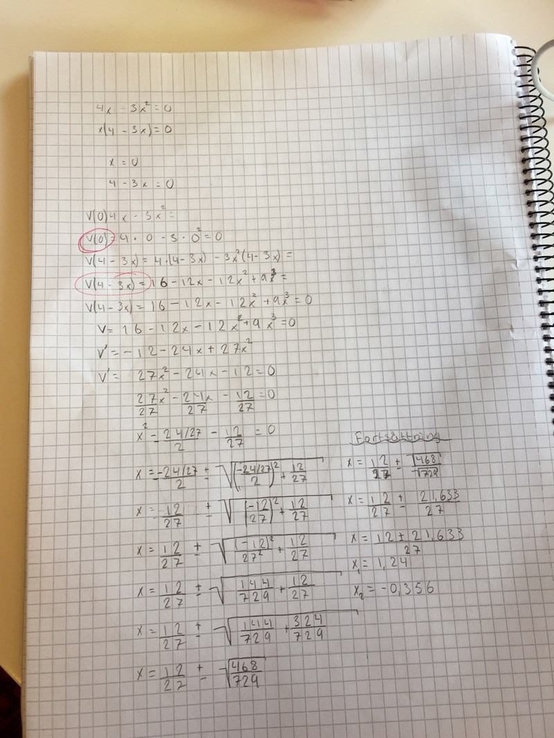 A'(x) = 0 då x = 0 eller då 4 - 3x = 0.