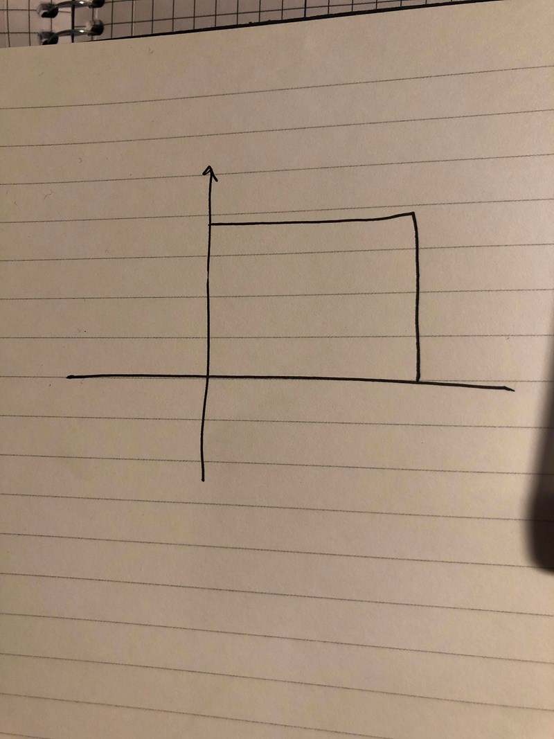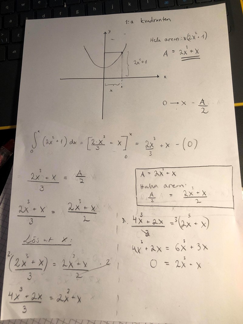 Detta blir arean, men nu när jag gått tillbaka till uppgiften känns det oklart med hur kurvan ska skära rektangeln. Det står att den ska skära diagonala hörnet, men hur vet du att grafen hamnar precis så där och inte på ett annat sätt?