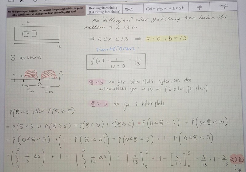 Uppgiften: På en gatstump av längden 13 m parkeras slumpmässigt en bil av längden 5. Vad är sannolikheten att en ytterliggare bil av samma längd får plats?
