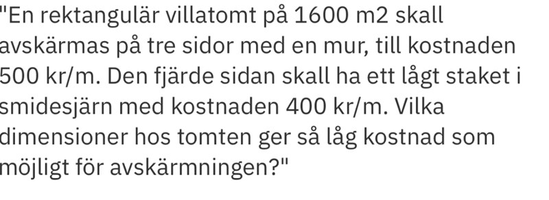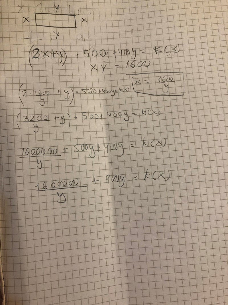Men arean kan du uttrycka i x och y och via detta samband får kostnaden att bara bli en funktion av x, dvs K(x).