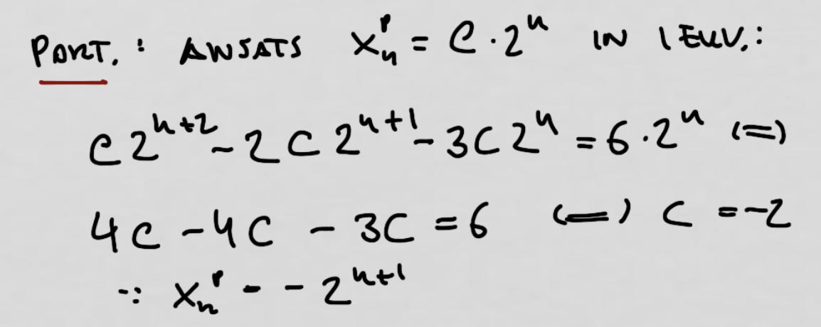 En inhomogen rekurrensekvation löses genom att addera den homogena lösningen med den partikulära lösningen.