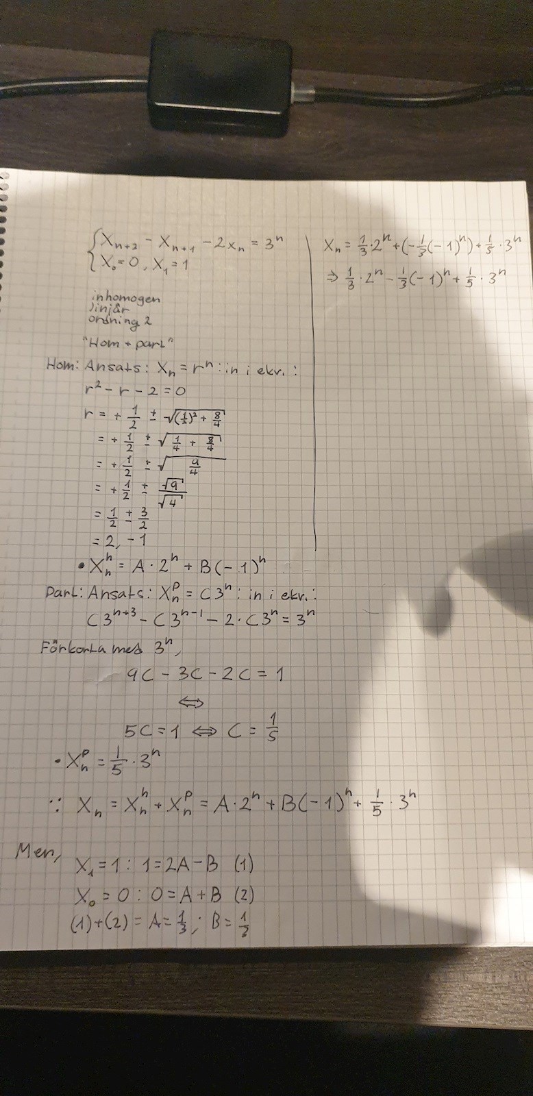 Som kan ses på bilden så har jag fått Homogenitetlösningen är: och att partikulärlösningen är: . Och sedan att konstanterna A = samt att B = . Vilket skulle betyda att den slutgiltiga lösningen för rekurrensekvationen skulle vara:
