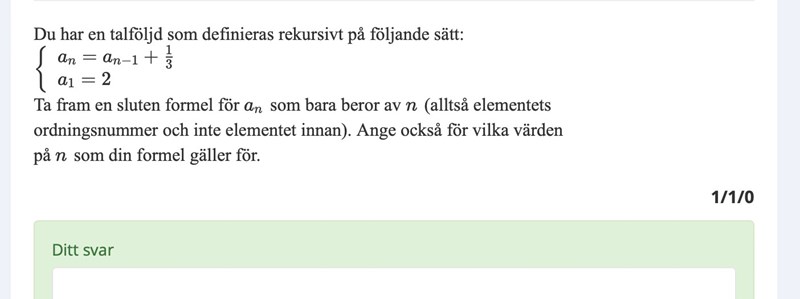 hej! jag förstår inte riktigt hur det funkar md rekursion, jag tittade på flera klippar på YouTube men kan fortfarande inte förstår jag kan skriva formler för talföljder. Exempel är dessa uppgifter som jag hade verkligen svårt i. Skulle vara tacksam om någon god själ förklara för mig hur jag behöver när det kommer till rekursiva formler!!! tackkkkk