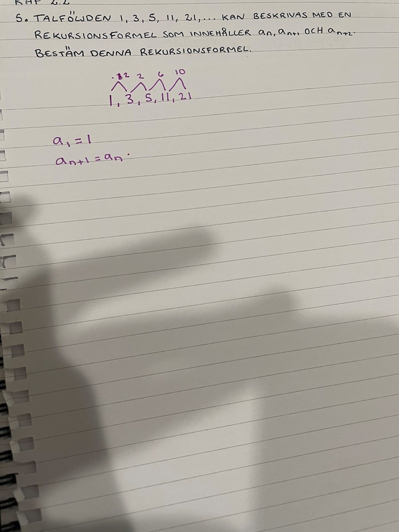 Svårt att tipsa utan att berätta allt, men jag kan säga att det är an = Aan-1 + Ban-2 för vissa värden på A och B.