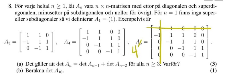 När du gör kofaktorexpansion ska du summera kofaktorerna, multiplicerade med respektive element i raden eller kolonnen du utvecklar längs, så du saknar ett minus- eller plustecken i din beräkning. Utvecklar du längs första raden eller kolonnen? Hur kommer du fram till ?