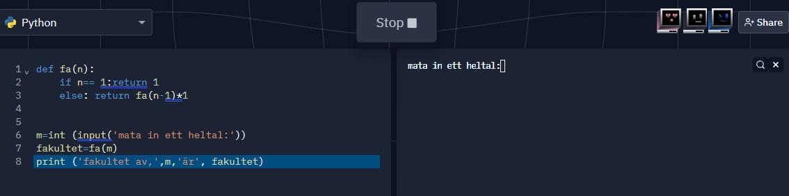 · print ('fakultet av' ,m, 'är' , fakultet)