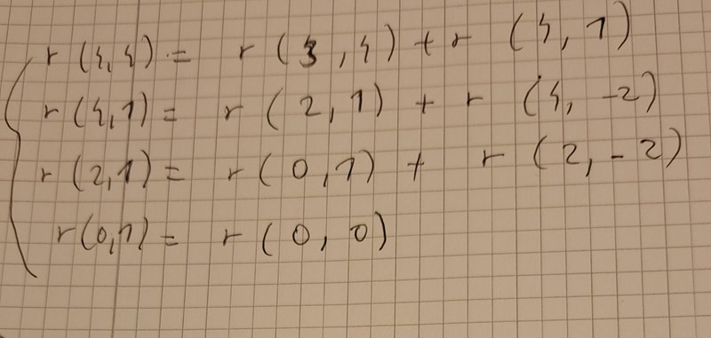 thedifference skrev:För att r(0,4) kommer trigga andra if-satsen. Jag har inte skrivit ut stegen för r(2,1). De är upp till dig att lista ut. Likadant med r(4,1) högre upp i trädet.