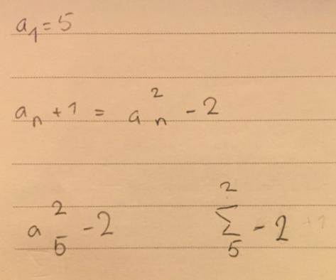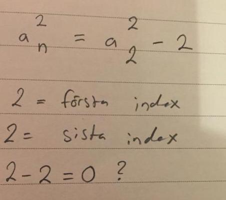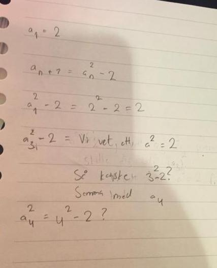 Du vet att an+1 = an2-2. Det står i uppgiften att a0 = 2 och vi har tidigare räknat ut att a1 = 2. För att räkna ut a2 använder vi formeln a2 = a12-2 och sätter in att a1 = 2, så a2 = 22-2 = 2. För att räkna ut a3 använder vi formeln a3 = a22-2 och sätter in att a2 = 2, så a3 = 22-2 = 2. För att räkna ut a4 använder vi formeln a4 = a32-2 och sätter in att a3 = 2, så a4 = 22-2 = 2. För att räkna ut a5 använder vi formeln a5 = a42-2 och sätter in att a4 = 2, så a5 = 22-2 = 2. Ser du mönstret?