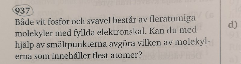 Om du kollar upp atommassan för fosfor och svavel så se du att de är snarlika. Alltså måste de starkare bindningarna hos svavlet bero på att det finns fler svavelatomer i varje svavelmolekyl jämfört med fosforatomer i fosformolekylerna.