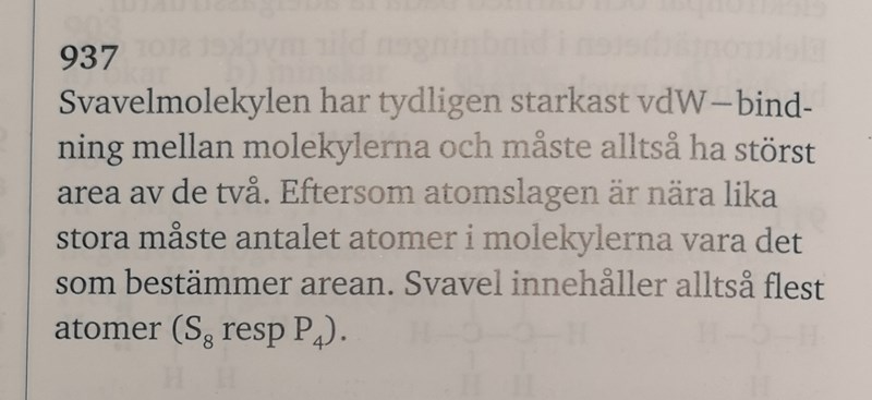 Det är inte alls självklart att svavel bildar föreningen S8 och fosfor P4, men det är heller inte nödvändig fakta för att kunna svara på frågan. Poängen är att svavel har en högre smältpunkt och därför måste ha starkare bindningar mellan molekylerna. Styrkan hos vdW-bindning beror på molekylernas area, men det är nästan alltid enklare att titta på molekylvikten (stor area brukar i de flesta fall höra ihop med hög molekylvikt, fast det är inte vikten i sig som ger de starka bindningarna).