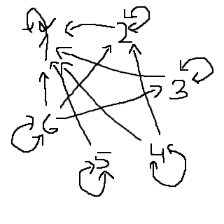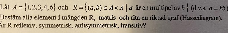 Därifrån ser jag att är reflexiv och transitive men varken symmetrisk eller antisymmetrisk. Jag är osäker på om det räknas som antisymmetrisk om bara någon av punkterna, som i detta exempel mellan 1 och 2 finns bara en riktning, har en riktning. Någon som kan förklara? Svaret är att den är reflexiv, transitive och antisymmetrisk.