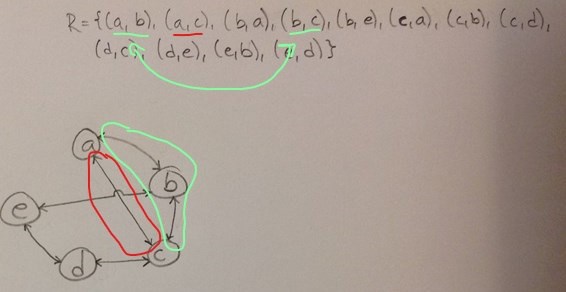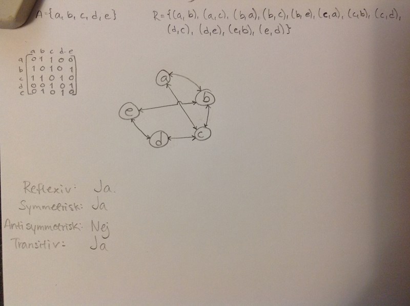 "Är R reflexiv, symmetrisk, antisymmetrisk och/eller transitiv om A = {a, b, c, d, e} och R = {(a, b), (a, c), (b, a), (b, c), (b, e), (c, a), (c, b), (c, d), (d, c), (d, e), (e, b), (e, d)}?