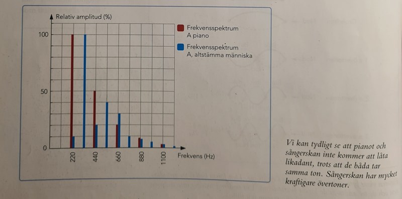 Okej, och då kan vi se att exempelvis andra övertonen för sångaren är större än första övertonen för pianot. Vi kan också se att andra övertonen för sångaren är lika stor (kraftig) som pianots grundton. Har jag tolkat grafen rätt?
