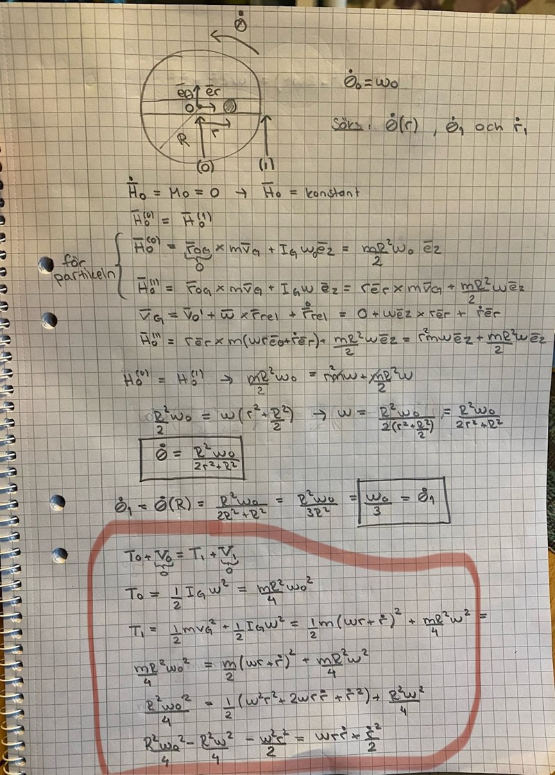 Har fått rätt på allt innan det röda markerade. Men vet inte hur jag ska göra istället för det där (markerade) för det blir fel. Antar att min definition på r(prick) är fel eftersom jag försökt jämföra med en annan lösning, men jag förstår inte varför. För r(prick) är ju partikeln radiella hastighet?