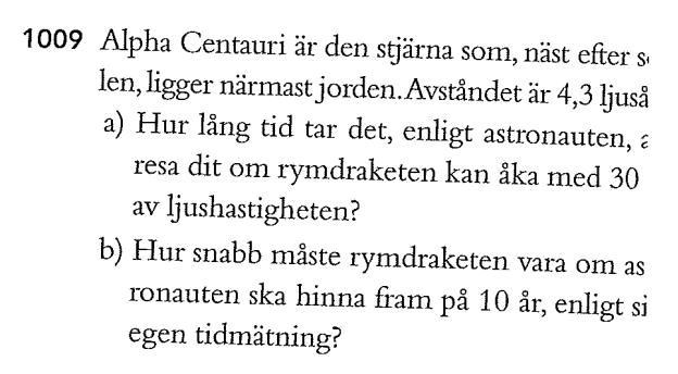 Tänker att s=vt kan ersättas med l=vt0 där t0 är 10 år eftersom det är den tid astronauten uppfattar.