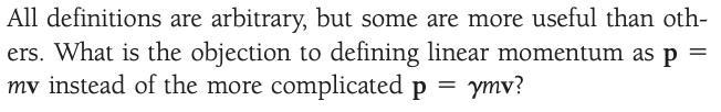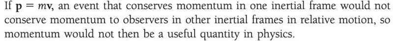 Förstår varför p=mv inte hade fungerat och hur man använder p=ymv när hastigheterna närmar sig c. Förstår dock inte riktigt vad dom menar med lösning till detta problem. Jag förstår ju att v=0 relativt till varandra för två olika system om de rör sig med samma hastighet, men förstår inte riktigt hur p=ymv löser det problemet. Kan inte riktigt måla upp en bild framför mig. Är det någon som skulle kunna ge sig på en annan förklaring ön den i boken?