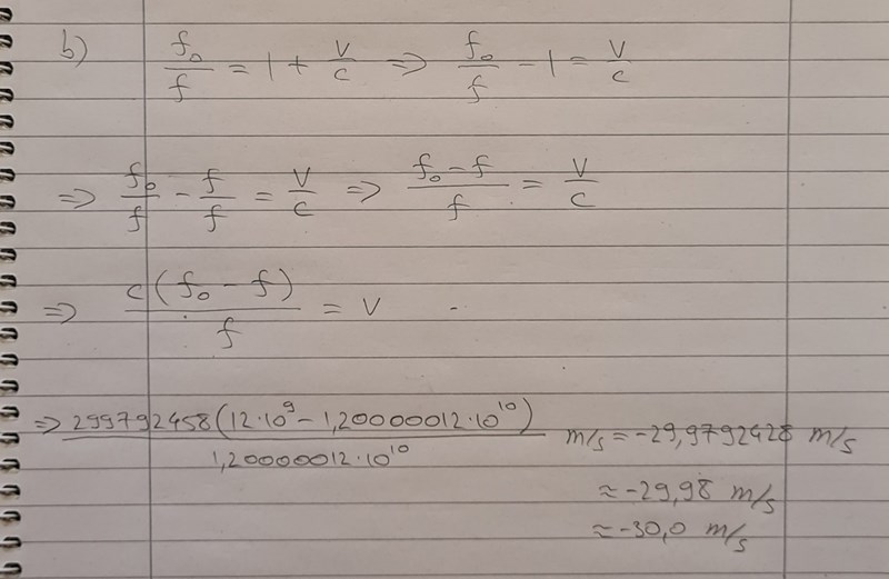 Jag förstår inte riktigt det här uppgiftsexemplet. Vilken frekvens är det som sänds ut och vilken frekvens är det som mottas? Är f eller f0 12 GHz? Hur ska man tänka i både i a) och b) uppgiften?