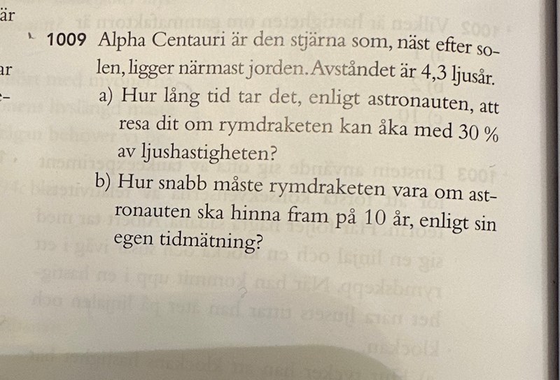 Vad är formeln för tidsförlängning? Jag tänker att a) borde kunnas lösa direkt genom den formeln. Kom ihåg, när du håller på relativitetsteori, att det är jätteviktigt att variablerna för tid (i tidsförlängning till exempel) motsvarar olika perspektiv. Det är därför viktigt att hålla reda på vilken du är intresserad av, om det är tiden det tar på jorden (för en människa på jordens perspektiv, eller tiden på rymdraketen... astronautens? perspektiv).