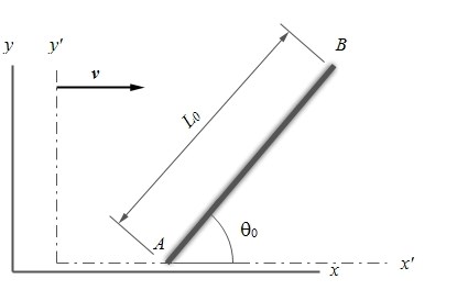 En stav som har en vilolängd L0 rör sig med en hastighet v längs horisontalriktningen. Staven ligger med en vinkel θ0 med x′-axeln:
