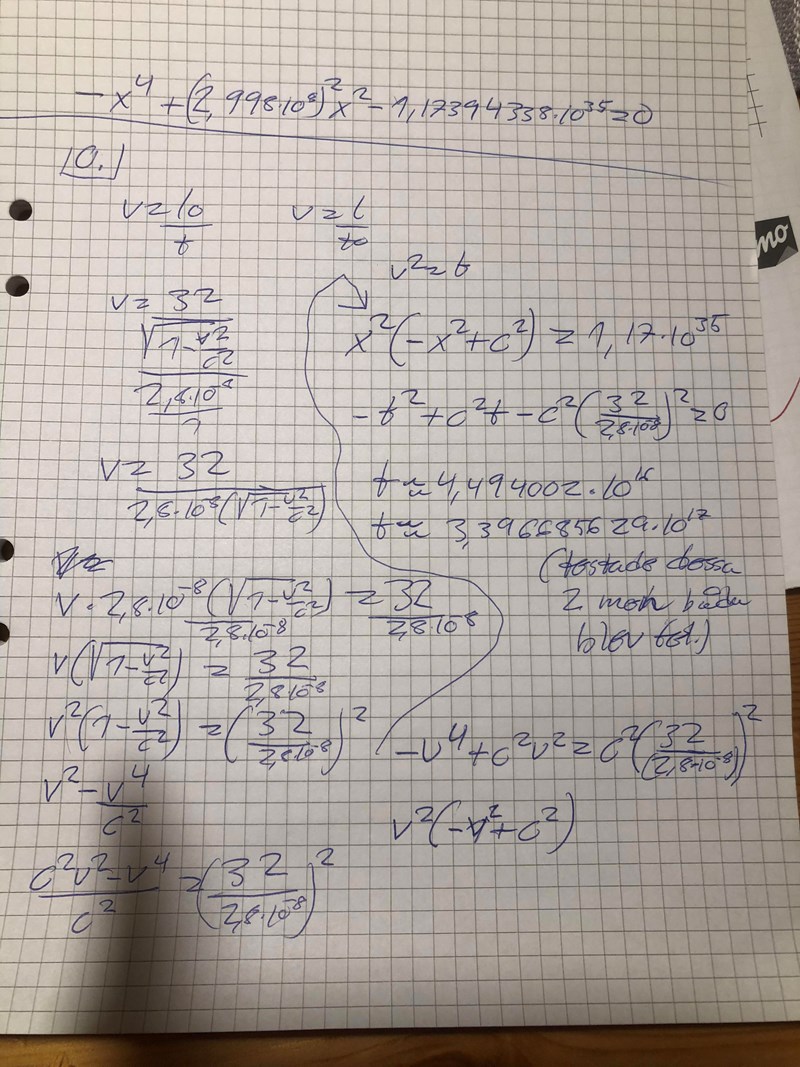 Jag fortsätter att lösa ekvationen och kommer fram till en 4:e gradare. Jag substituerar v^2 = t och får fram ett realt svar som ungefär är = 4,49 x 10^16 vilken ger att v ungefär är = 0,71c vilket är fel svar.