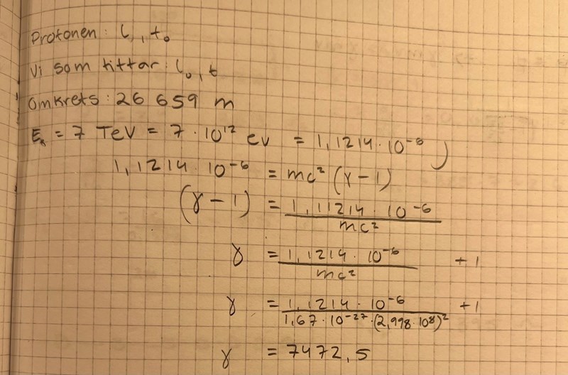 ”Protonaccelerationen LCH vid CERN i Schweiz är cirkelformad med omkretsen 26 659 m. Protonerna i ringen har rörelseenergin 7 TeV. Hur lång tid tar ett varv ur protonernas perspektiv?”