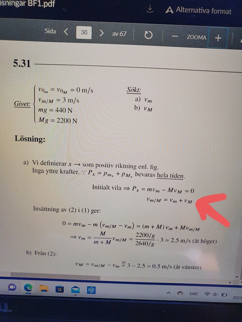 Ska det inte vara p=mvm + MVM =0 alltså allt är i vila.