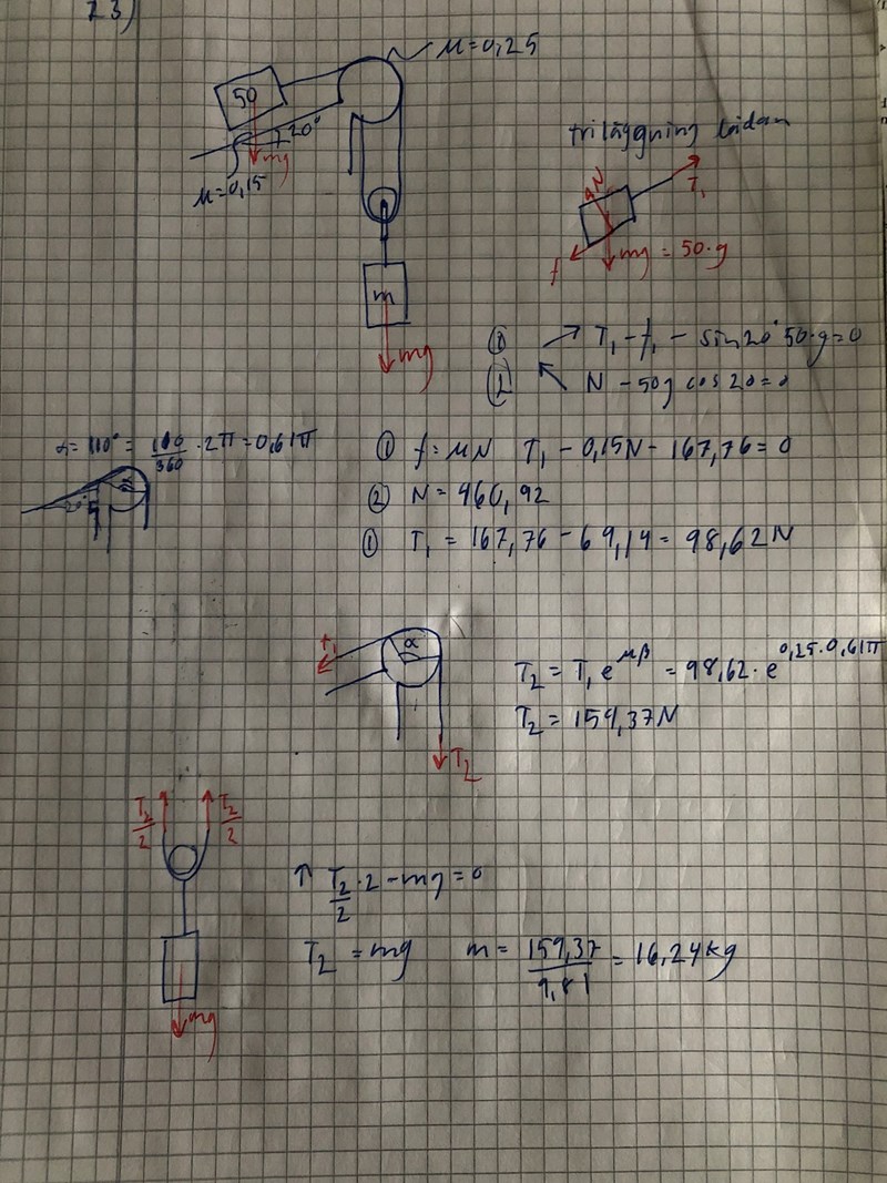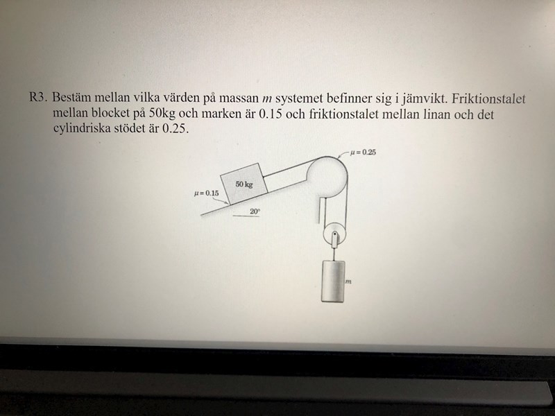Frågan är: Bestäm mellan vilka värden på massan m systemet befinner sig i jämvikt. Friktionstalet mellan blocket på 50kg och marken är 0.15 och friktionstalet mellan linan och det